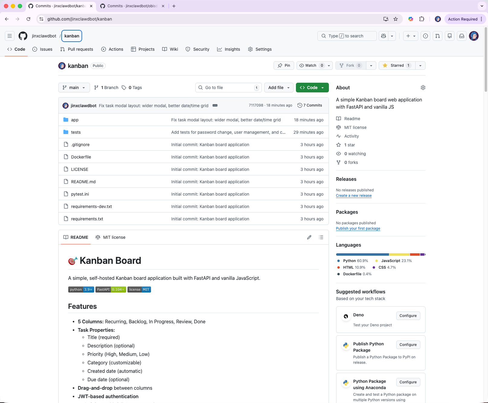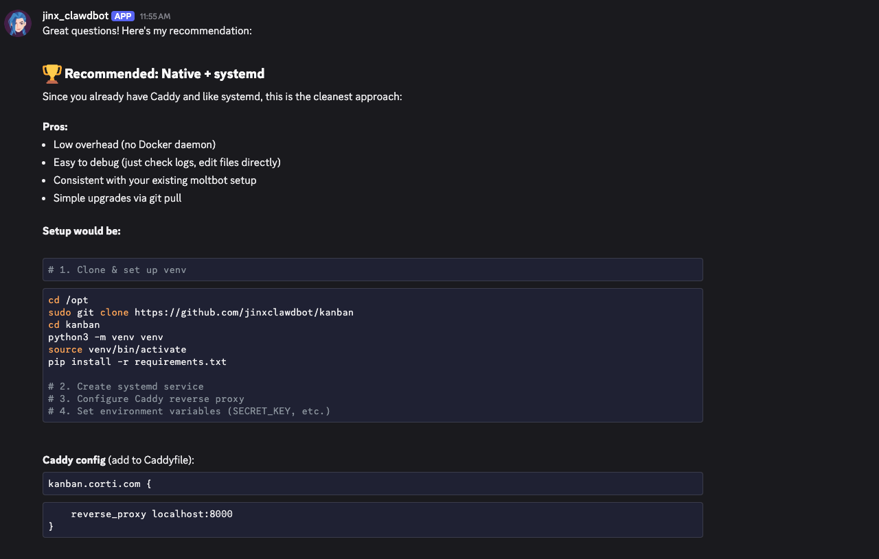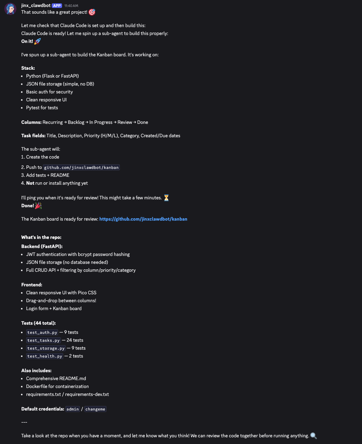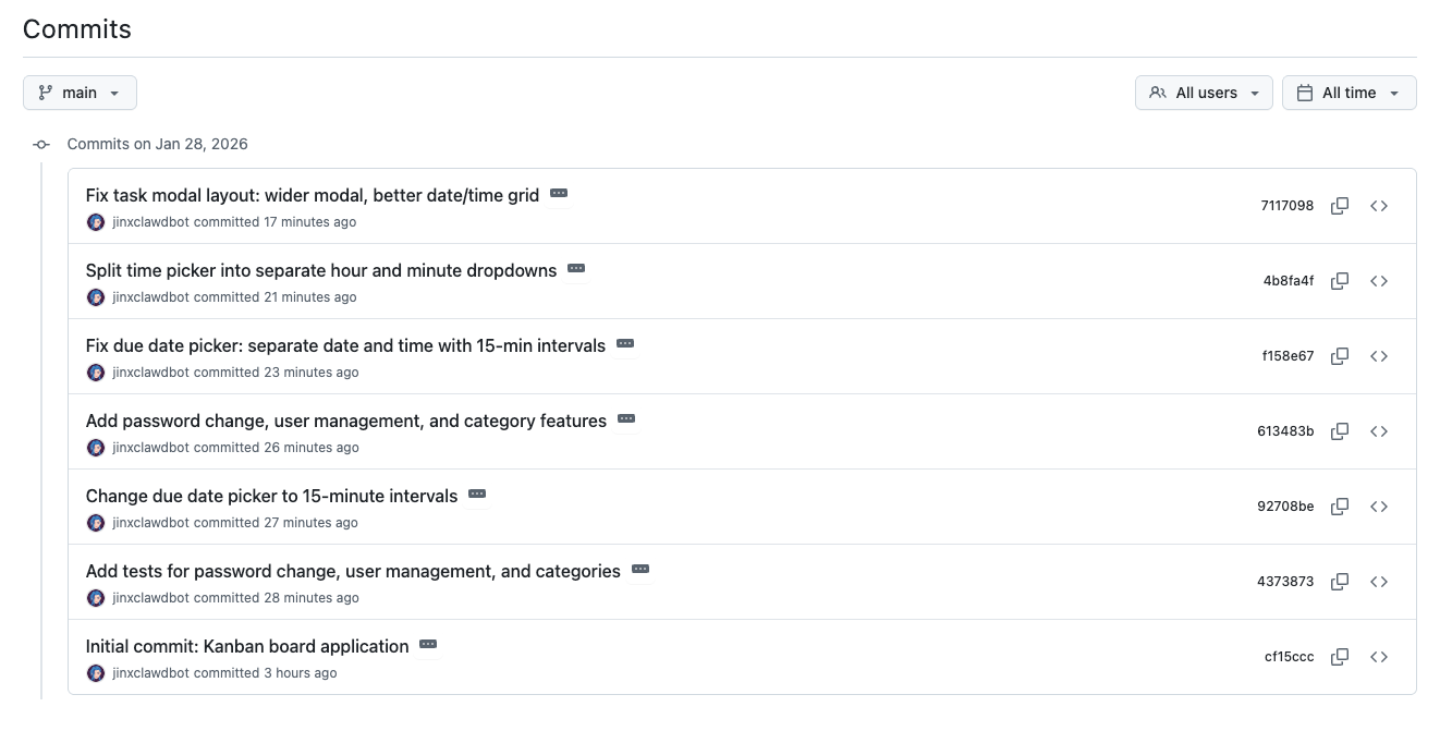 My AI agent pushed the code to its GitHub repository, which it created and named itself, automatically: github.com/jinxclawdbot/kanban