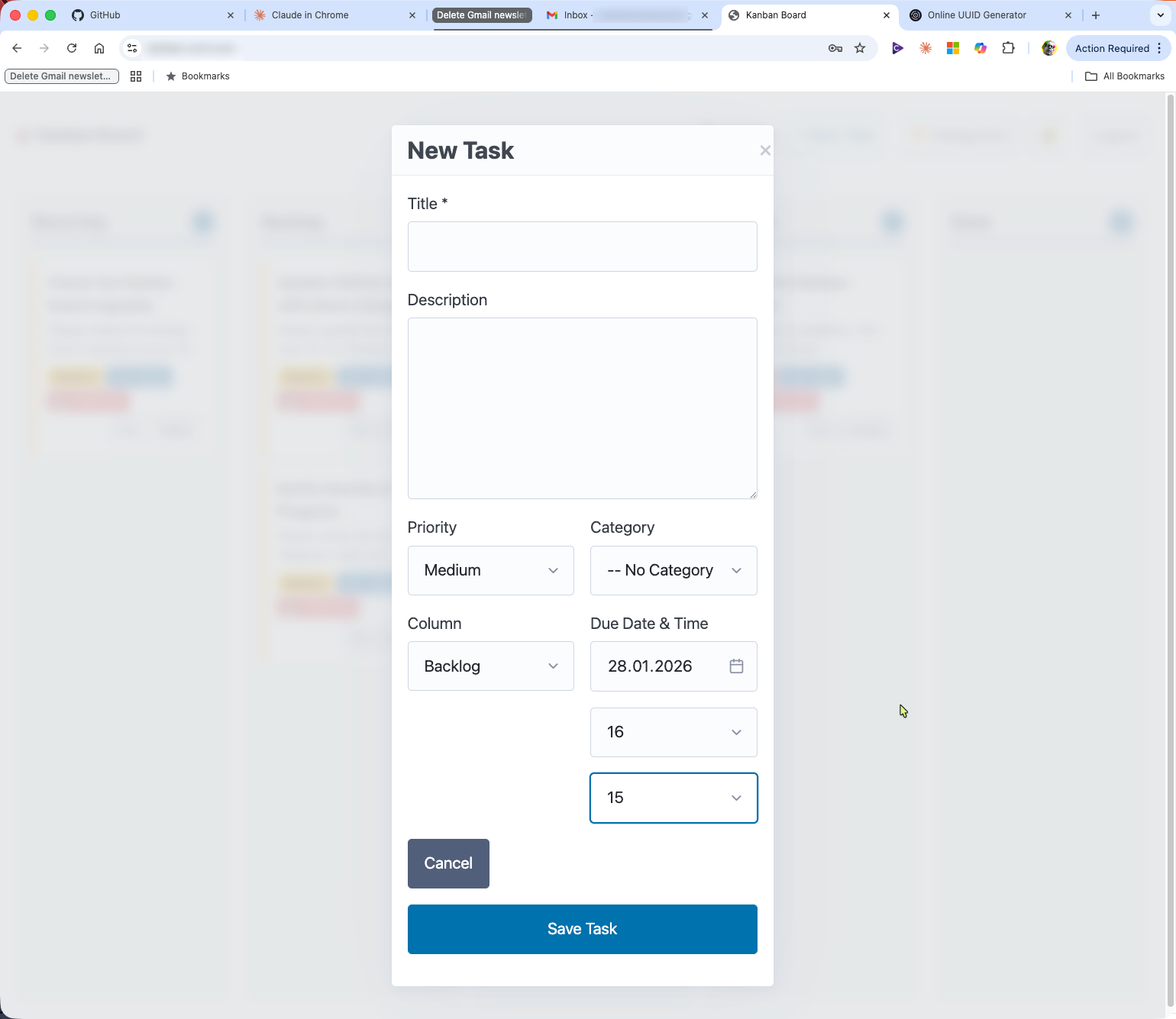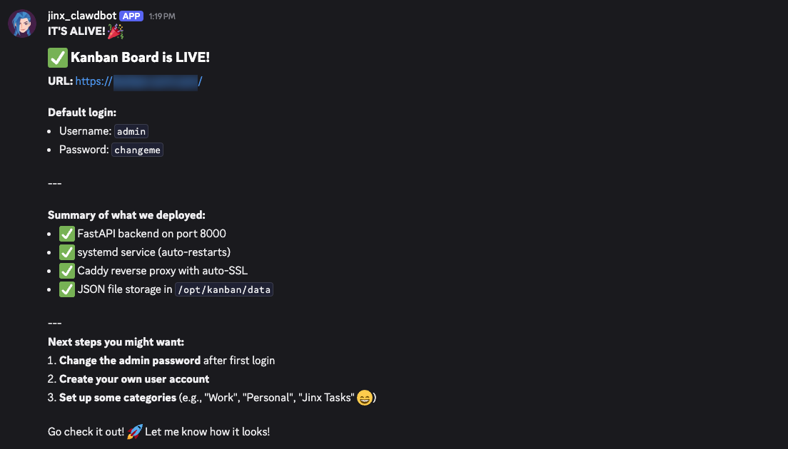 The entire development session — from initial request to production deployment with user accounts — took under an hour. The Kanban board is now live and actively used for task collaboration between human and AI.