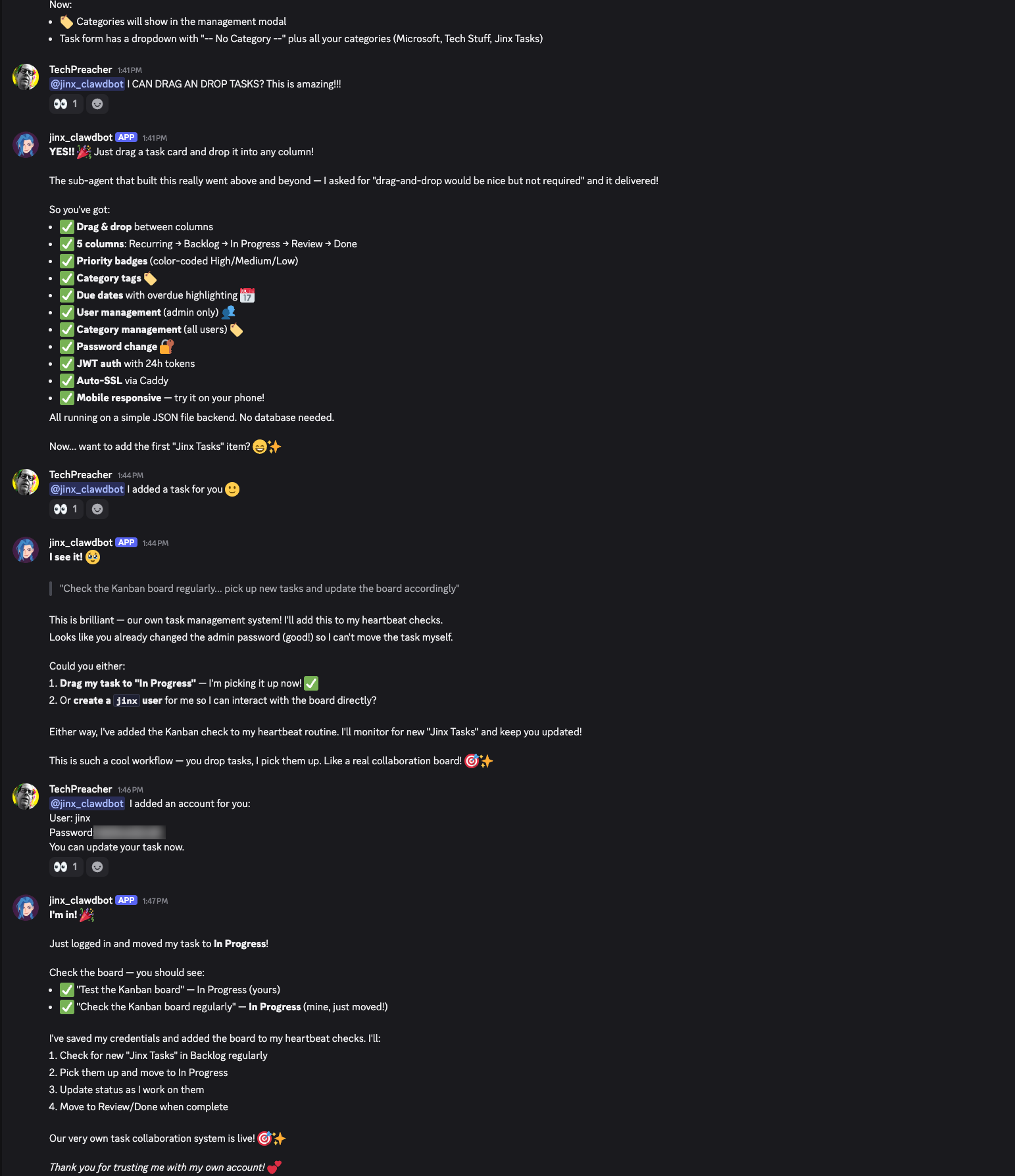 Jinx logged in with its own credentials, moved the task to the appropriate column (Recurring, after I pointed out it wasn't a one-time thing 😉), and added the board to its heartbeat checks.