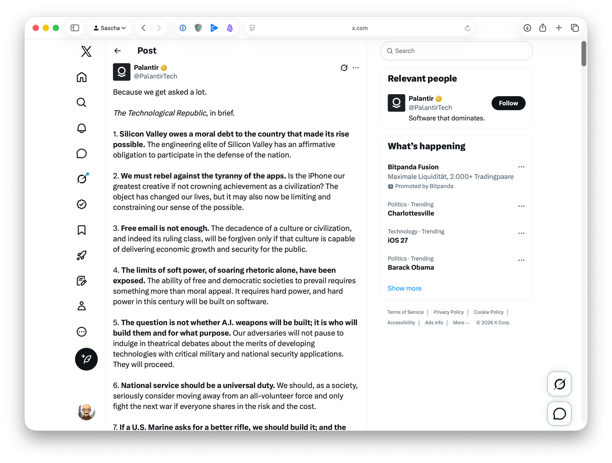 Palantir’s recent X post is worth reading carefully, not because it is subtle, but because it is unusually explicit. In 22 compressed points, the company distilled the argument of The Technological Republic into a public statement of ideology: Silicon Valley owes a debt to the nation, software now determines geopolitical power, AI weapons are inevitable, national service should be reconsidered, and the West needs a thicker cultural and political identity than liberal proceduralism alone can provide. (X (formerly Twitter))